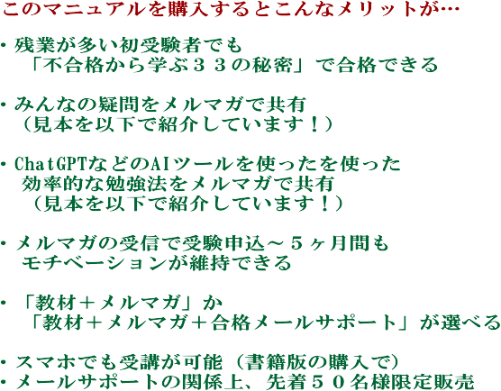 マニュアル(PDF版)+メルマガ+合格メールサポート : 31,700円(税込)