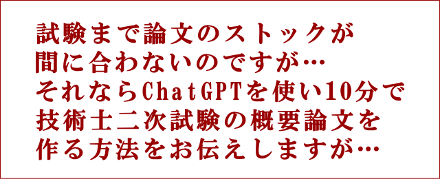 今度の技術士二次試験までに論文のストック数を間に合わせたいという方は、今すぐここをクリックしてください。